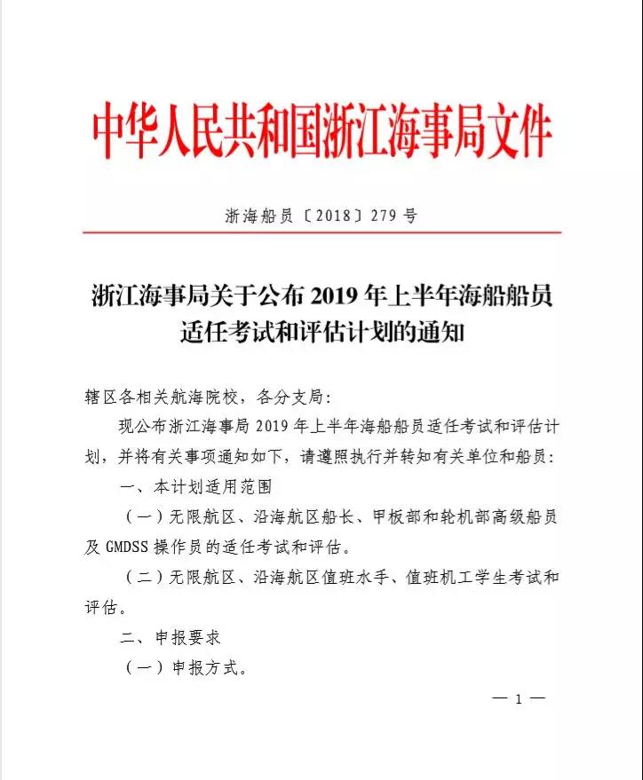 现将浙江海事局2019年上半年船员适任考试和评估计划等事项通知如下,请遵照执行并相互转告。
