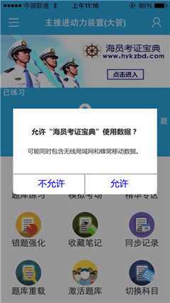 4、重新打开“海员考证宝典”就会接受到提示,如图所示。提示你是否允许“海员考证宝典”使用数据?一定要点击“允许”。点击之后就可以联网啦!
