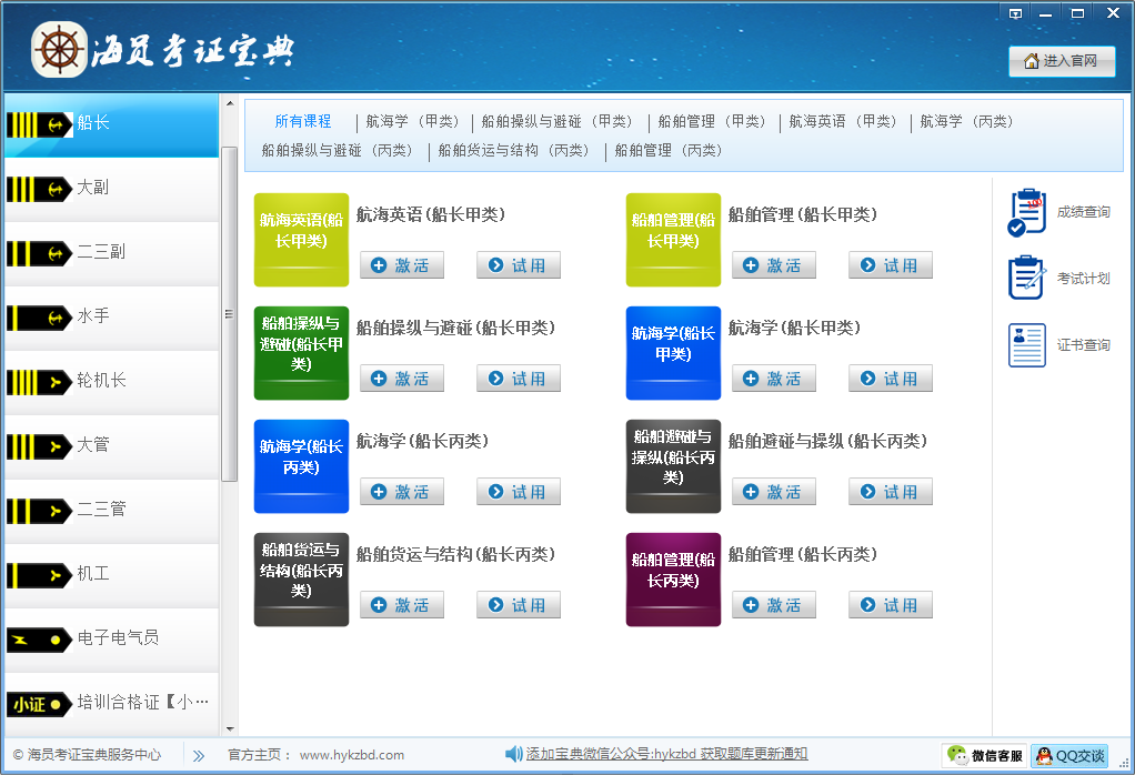 海员考证宝典服务中心(上海)专注于海员教育培训行业,经过多年的积淀,开发出了拥有自主知识产权的海员考证软件产品——《海员考证宝典》(软件著作权苹果版证书号:第1215168号;软件著作权安卓版证书号:第1216668号),搭设跨平台的"云考试"系统,涵盖了海员各职位执业职称的培训考试产品,提供手机版、平板电脑版、电脑版,是随时随地的考试助手。