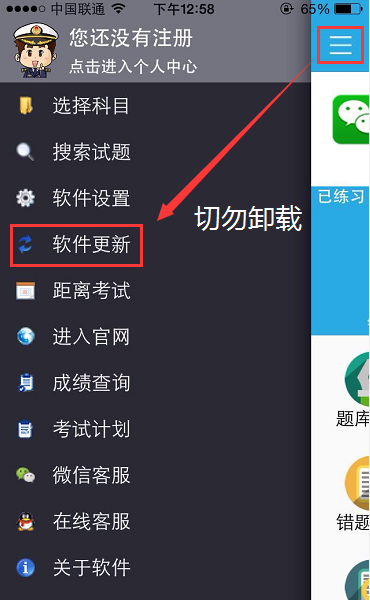 3、如下图在客户端左侧点击软件升级即可,也不要下载题库,重新进入即可。