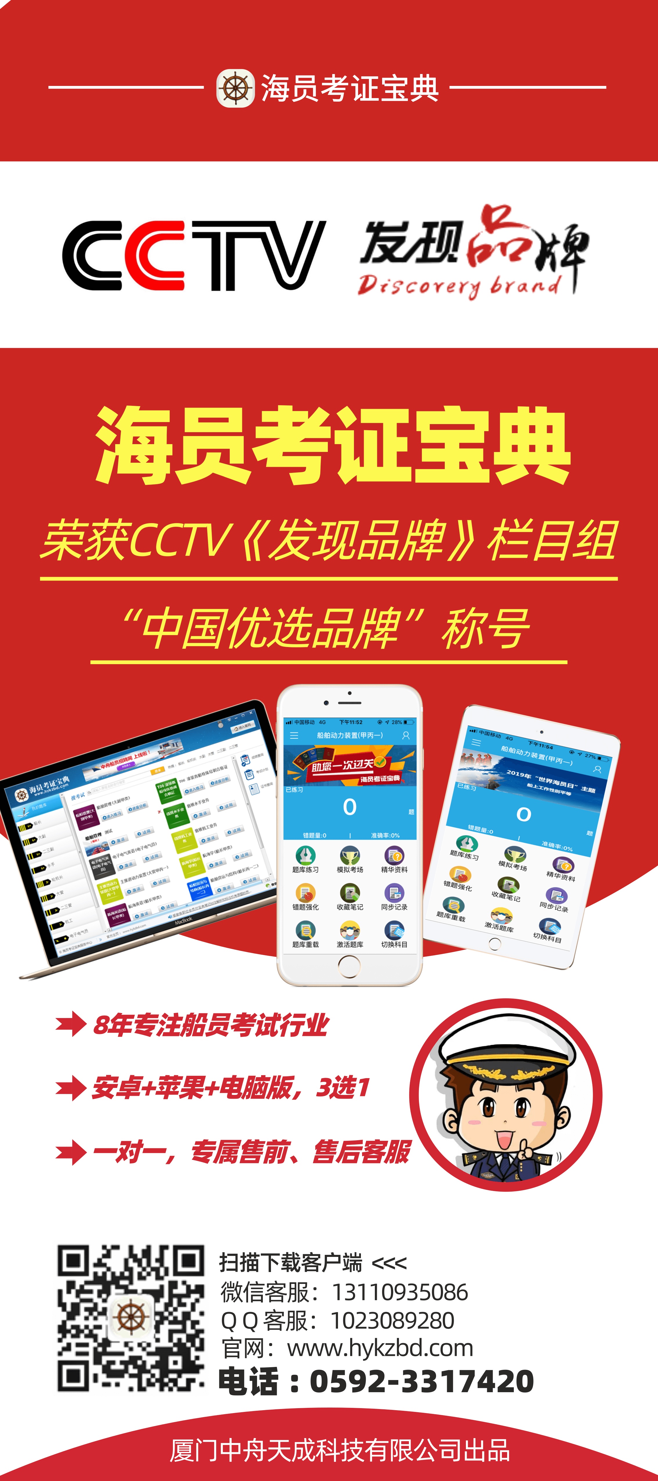 “海员考证宝典”是厦门中舟天成科技有限公司旗下软件品牌,是经过多年的积淀开发,拥有自主知识产权的船员考试应用软件——《海员考证宝典》。(软件著作权电脑版登记号:2017SR401759;苹果版登记号:2016SR036551;安卓版登记号:2016SR038051),软件搭设跨平台的“云考试”系统,涵盖了船员各职位的培训考试课程题库,提供手机、平板、电脑版,供船员考试随时随地复习的好助手。是目前国内船员考试首选的复习软件,风靡各大海事院校。