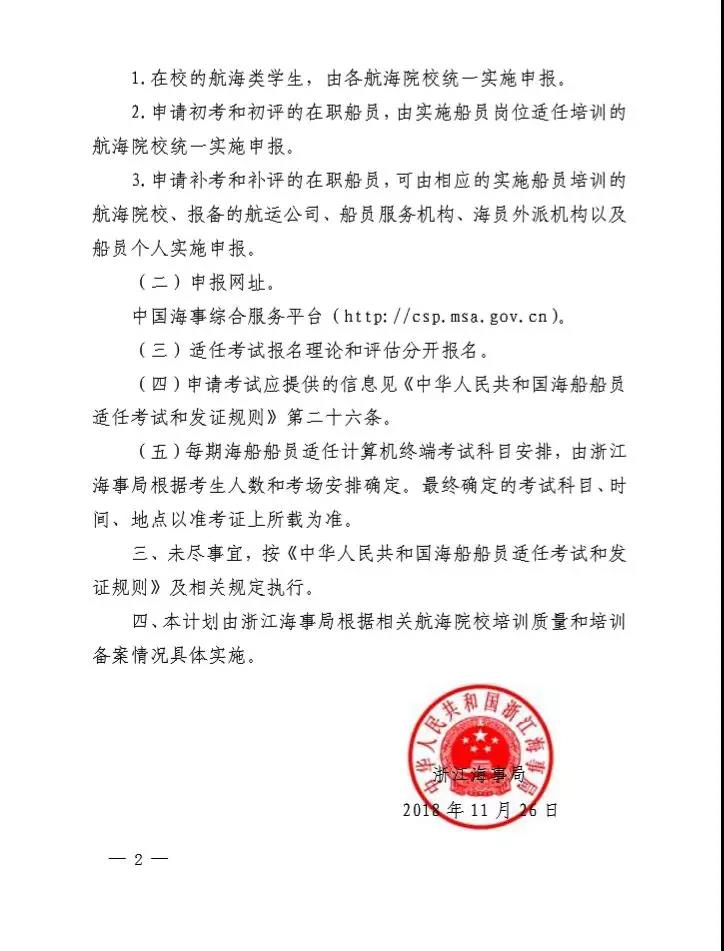 2019年浙江省海事局上半年海船船员适任考试和评估计划